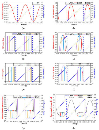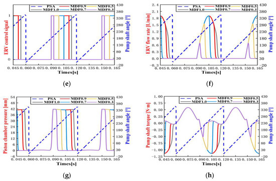 The simulation results of DERDP in ERM with different MDF: (a) Piston displacement; (b) flow rate of CV; (c,d) control signal and flow rate of ERV; (e,f) control signal and flow rate of SV; (g) piston chamber pressure; (h) Pump shaft torque.