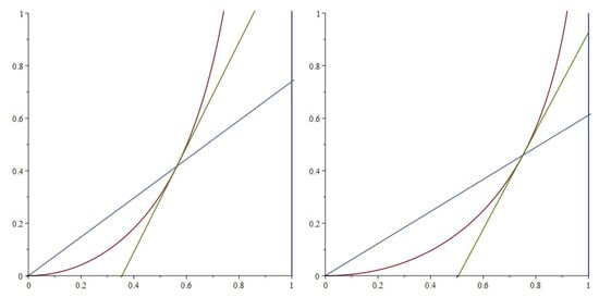 One can find approximate solutions of Equation (2) using power series. If we substitute in Equation (2), we find that . By taking the derivative of Equation (2) and substituting , we can find . By continuing this process, we can find , etc. Therefore, the two solutions are and . Maple 2022 software was used to calculate these four nonzero terms of the series, which were then used in GeoGebra to draw Figure 1.