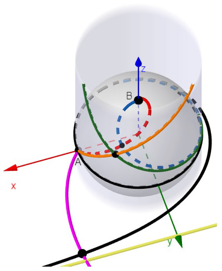 Note that in the literature, the expression spherical spiral is sometimes used for different curves. In Figure 4, we used parametrization for this curve (red curve) ([22], Lemma 8.27), the parametrization for (orange curve), which is the Mercator projection of the previous curve onto the cylinder, parametrization for (green curve), which is the Mercator projection of interception curve Equation (7) (blue curve). Note also that in Figure 4, the stereographic projection of Equation (7) onto the plane, with respect to pole B, is a plane spiral curve (black curve), which in polar coordinates can be written as . Indeed, by Equation (7),