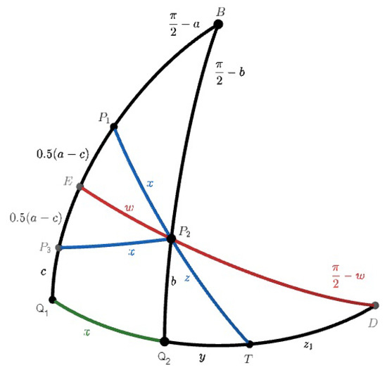 We take another point on arc such that . Such a point, , should exist, because . We denote the midpoint of by E and let . Then, . Since spherical is isosceles, is its angle bisector and is perpendicular to . The three angles of the quadrilateral are right angles. Therefore, the fourth is obtuse and is acute. Since , is acute, too. Similarly, is acute. Consequently, is obtuse. Consequently, and are obtuse, and are acute. Therefore, by Equation (8), and . Similarly, and . Therefore, and . We denote the intersection of the great circles and by D. We also denote , , , . Then, and . It remains only to show that . This follows from the fact that spherical is isosceles. Indeed, and . Consequently, or . Finally,
