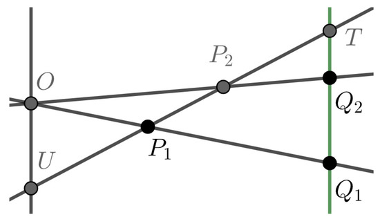 Lines passing through point O and points and on a parallel line are drawn. A line intersects these lines at U and T, and the segments and at points and , respectively, so that (see Figure 7). Then,