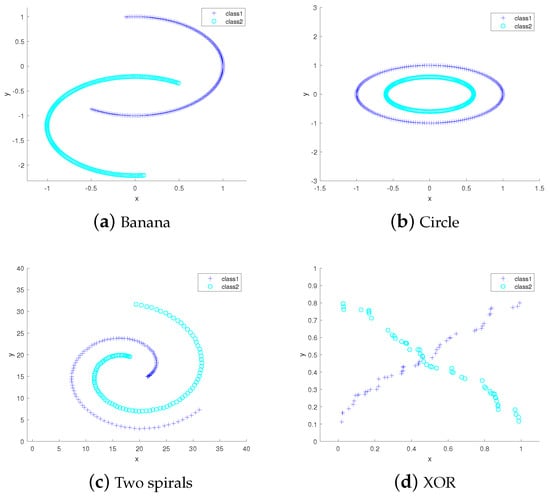 We first do experiments on the Banana, Circle, Two spirals, and XOR datasets which are generated by trigonometric function(sine, cosine), two circle lines, two spirals lines, and two intersecting lines, respectively. The two-dimensional distributions of the four synthetic datasets are shown in