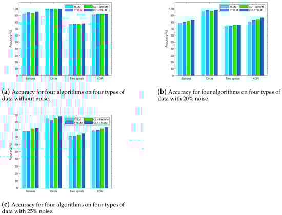 -FTELM for four datasets with 0%, 20%, and 25% noise in terms of accuracy. From