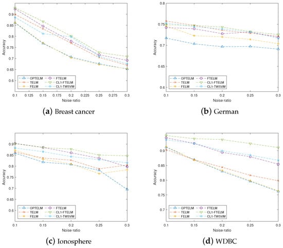 -FTELM requires a lot of time in the process of training to iterative calculation, eliminating outliers, and computing graph matrices. In addition, we used different noise factor values (0.1, 0.15, 0.2, 0.25, 0.3) on the Cancer, German, Ionosphere, and WDBC for the six algorithms. The experimental results are given in