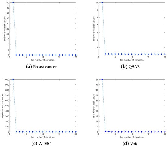 We also conduct experiments on four data sets (Breast cancer, QSAR, WDBC, and Vote) to verify the convergence of the proposed Algorithm 2. As shown in