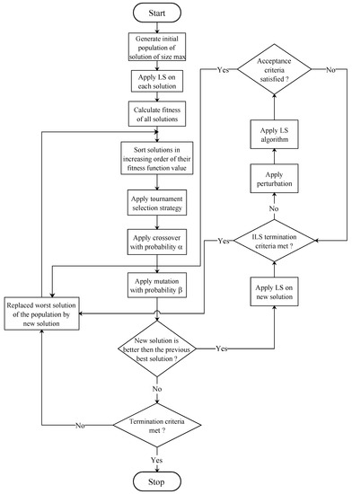 In the selection process, more duplications of candidate solutions with higher fitness function values are made to enforce the survival-of-the-fittest mechanism. The reproduction stage uses crossover and mutation operators for the selected parents. In the crossover, segments of two solutions in the population are combined to obtain new and possibly improved solutions. In contrast, a solution is modified locally in a random order in the mutation process. Finally, the original parental population is replaced by a population of offspring solutions generated through the selection and reproduction processes. This replacement includes keeping the best solutions and removing the worst ones. The selection phase ensures better utilization of healthier offspring, while the reproduction phase ensures adequate exploration of the search space. Natural selection ensures the propagation of better fitness function values on chromosomes in future generations. The algorithmic layout of GAILS can be found in Algorithm 1. The complete working procedure of GAILS is shown in the flow chart in Figure 1.
