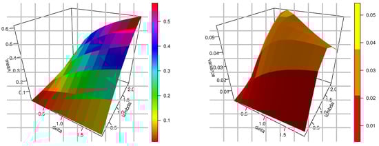 Table 2 shows some numerical values of moments, variance (), skewness (), kurtosis (), and coefficient of variation (CV) for the KMPTL distribution. Figure 4 shows 3D Plots of moments for the KMPTL distribution. Figure 4 shows that when the value of increases then the values of variance, skewness, kurtosis, and CV decrease, but the values of mean and index of dispersion (ID) increase.