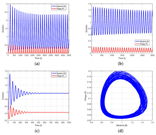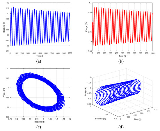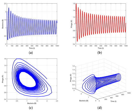 is unstable when : (a,b) time series evolution of bacteria and phages; (c) presence of periodic solution; (d) phase portrait in t-B-P space.