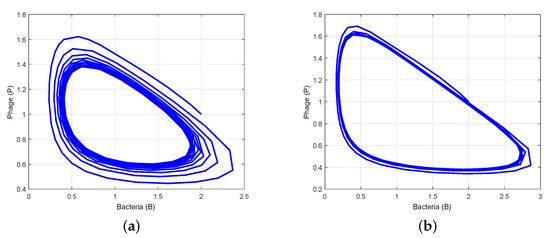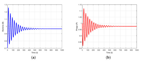 It can be inferred from Theorem 7 that Hopf bifurcation arises in System (3) at the critical value . When the value of is increased to , the system loses stability and undergoes Hopf bifurcation (Figure 3). When , System (3) enters an unstable equilibrium via Hopf bifurcation at the interior equilibrium , indicating that the densities of bacteria and phages oscillate periodically (Figure 4). However, the system achieves a stable equilibrium state when , indicating that the densities of bacteria and phages tend towards a steady state (Figure 2). Our research indicates that oscillatory behavior is feasible in certain circumstances and that a delay can cause a stable equilibrium to evolve into an unstable one.