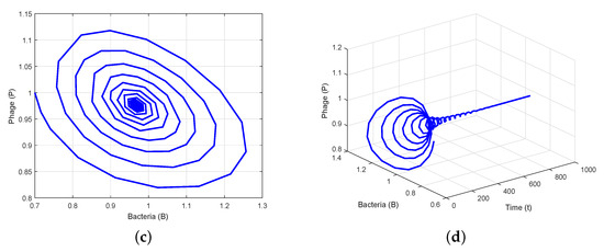 is asymptotically stable when : (a,b) time series evolution of bacteria and phages; (c) phase portrait in B-P plane; (d) phase portrait in t-B-P space.