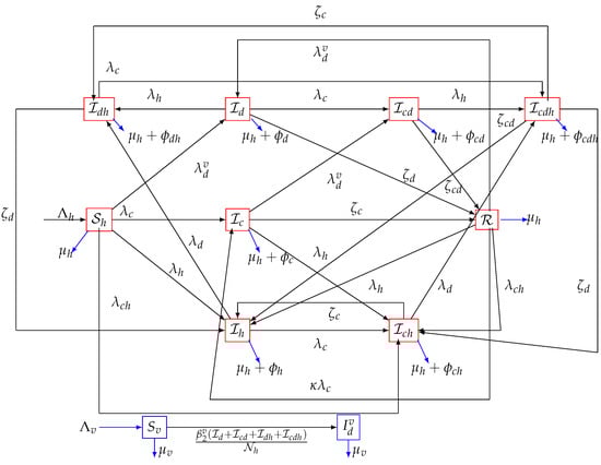 In order to avoid complications in the model, asymptomatic classes for either COVID-19 or dengue were not assumed. The model also considered only the HIV infection stage, without assuming the full-blown AIDS stage. Although the authors recognize that asymptomatic individuals could play a crucial role in the transmission dynamics of infectious diseases, by omitting asymptomatic classes, the model fails to capture the full spectrum of disease severity and transmission patterns. This could also result in an incomplete representation of the interactions between the three viral diseases and their impact on the population. By excluding asymptomatic individuals and those with full-blown AIDS, the model may underestimate the true burden of each disease and their interactions. Individuals with full-blown AIDS may experience different clinical outcomes and interactions with COVID-19 and dengue compared to those with HIV infection alone. The authors also acknowledge that the findings of this study may have limited generalizability to real-world scenarios, since asymptomatic individuals and those with full-blown AIDS are excluded. Thus, future work in this regard is desirable, to fill the research gap that this study has created. Moreover, there is not much information available regarding vaccine or infection-acquired cross-protection between COVID-19, HIV, and dengue. There is no detailed clinical information on whether the currently available COVID-19 or dengue vaccines could cross-protect against infection with HIV. It should be stated that understanding the potential cross-protection between vaccines for COVID-19, dengue, and HIV is crucial. Future research will focus on evaluating the potential cross-reactivity or immune interactions between vaccines, exploring whether vaccination against one disease could provide a degree of cross-protection against the other two, and assessing the potential impacts on disease severity and transmission dynamics. The model parameters and flow chart (describing other transitions in the model) are presented in Table 1 and Figure 1, respectively.