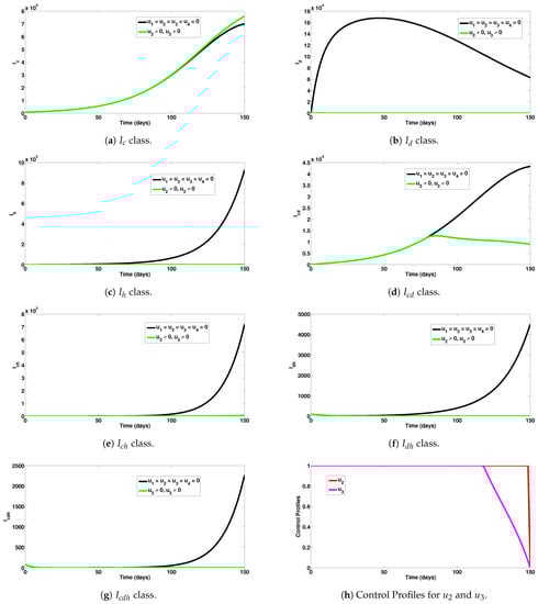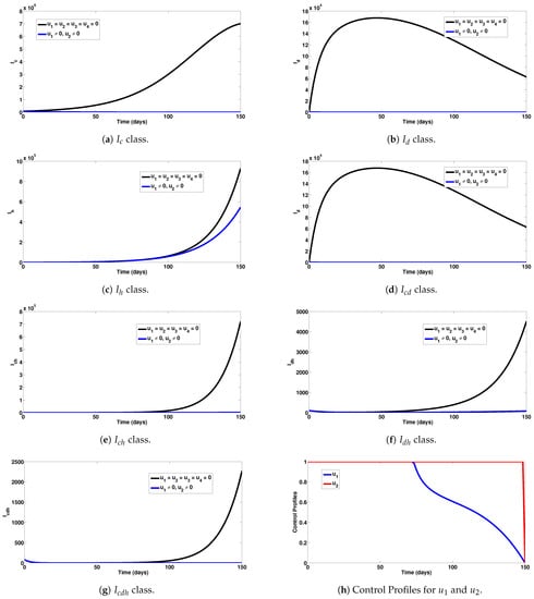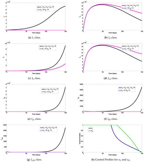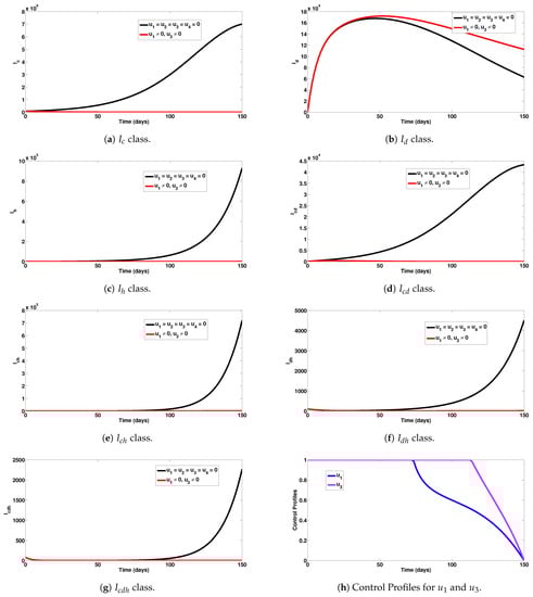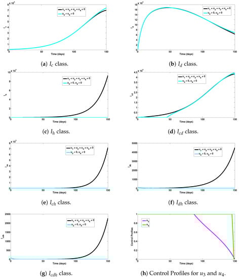 In order to model the dynamics of multiple infectious diseases, optimal control has proven to be a useful method. A thorough analysis of a dynamical model for the Zika virus with optimal control was carried out by Khan et al. []. Jan et al. [] analyzed a dengue viral intervention model. Ullah et al. [] examined a hepatitis B viral model with optimal control. In addition, the authors in [] studied a COVID-19 and dengue co-infection model with optimal management, utilizing Brazilian data as a case study. They demonstrated that a COVID-19- or dengue-specific preventive strategy would be sufficient to control both illnesses. Using actual data from Yemen, Hezam [] created a revolutionary dynamical optimum control model for COVID-19 and chikungunya outbreaks. The authors of [] investigated a dynamical optimal control model for COVID-19 and Zika virus. Other models with optimal intervention measures can also be found in previously published papers [,,,,,].