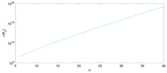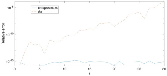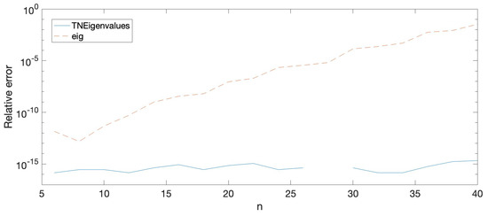 Then, in order to compare the accuracy of the approximations to the eigenvalues obtained with Matlab in these two ways (eig and TNEigenvalues) we have obtained the relative errors considering the eigenvalues obtained with Mathematica as exact. The eigenvalues of have been arranged in a decreasing order () to illustrate the computed relative errors. In Figure 1, the relative errors of the approximation to these eigenvalues by both methods have been displayed. Although we have calculated the relative errors of both methods for a discrete number of eigenvalues, in order to improve the readability of the picture, the piecewise linear interpolant of these errors has been plotted for each method (piecewise linear interpolants have also been used in the following figures of the paper). The figure shows that using to HRA together with the function TNEigenvalues of Koev software library ([20]) provides much better results than these obtained by using the usual Matlab function eig from the point of view of accuracy.