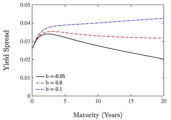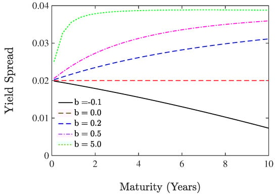Secondary firm B: term structure of yield spreads with , and a different value of . The risk-free interest rate is assumed to follow the JCIR process in which the parameters for the JCIR model are chosen from [7,31] with .