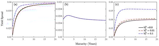 Secondary firm B: term structure of yield spreads with , , , and different . Panel (a) exhibits a flat default-free term structure. Panel (b) assumes the risk-free interest rate follows the CIR process in which the parameters of the CIR model are taken from Wu [31] and Jarrow and Yu [7] with . In Panel (c), its difference with Panel (b) is that interest rate is driven by a jump process, while the parameters are the same, except that .