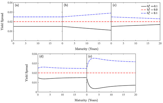 In contrast with the Markov model based on the ratings of Jarrow et al. [33], in our model, we ignore the interaction between market risk and credit risk. Usually investment-grade issuers’ credit spread curves are upward-sloping, while those of speculative-level issuers are tilted downward. However, when the possibility of default is affected by economy-wide risk factors, there will be additional aspects to this problem, as illustrated in Figure 1. Except for Panel (a), obviously, the shape of the default-free term structure and the coefficient jointly determine the term structure of the credit spread.
