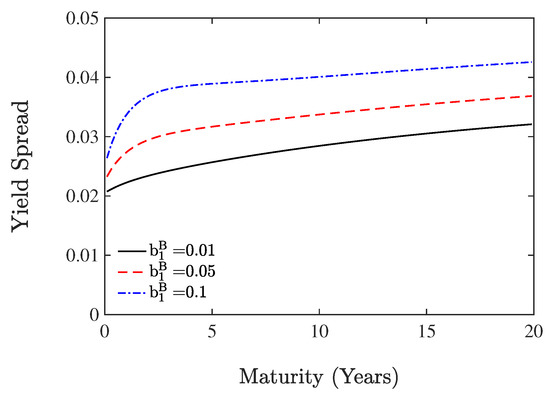 Until now, within the primary–secondary framework, we obtain the explicit pricing of defaultable bonds. Now, we pay attention to the yield spread, which is a function of maturity to explore the effect of counterparty risk on firm B’s bond price. In continuous-time modeling, we define the yield spread between defaultable bond v and default-free bond p as