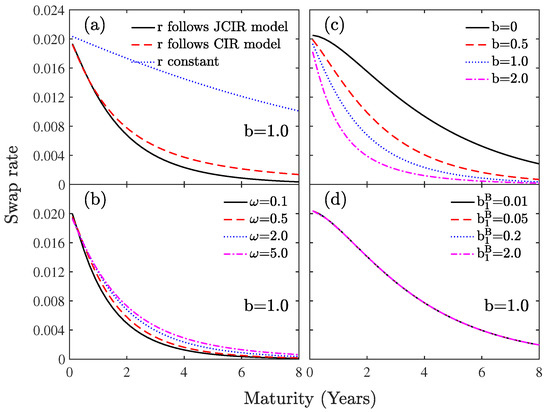 Firstly, in panel (a) of Figure 6, in terms of the influence of risk-free interest rate forms chosen, although the swap rate decreases with the same trends, consistent with the intuition, there is a clear difference between the results of our model and the others. The swap rate, compared with applying the JCIR process, is overestimated in the other cases. These results clarify the essential modification of the swap rate when applying JCIR process for the risk-free interest rate.