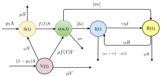 At time t, the population is divided into five distinct subclasses: the susceptible subclass (), the vaccinated subclass (), the latent subclass (), the infectious subclass (), and the recovered subclass (). In , a represents the latent age of the exposed individuals. represents the density of the latent class at time t with latent age a. Then, the total number of latent individuals at time t is . Figure 1 below illustrates the inter-relationships among these subclasses.