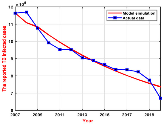 Next, we utilize to simulate China’s annual tuberculosis patient data. We use MATLAB 2018b software to estimate Using the Grey Wolf Optimizer (GWO) algorithm, we can estimate the unknown parameters and initial values for model (1), as shown in Table 3. The results of the simulation are presented in Figure 2.