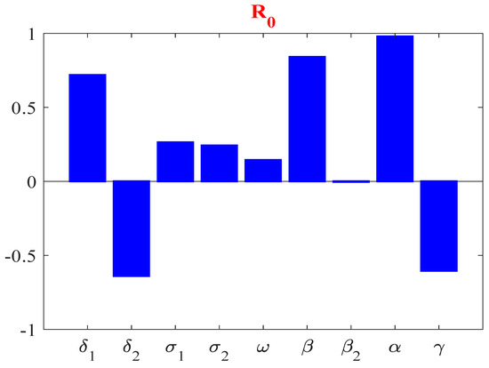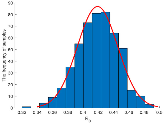 In this paper, a sensitivity analysis (SA) is used to identify the parameter that has the greatest impact on . We use the partial rank correlation coefficient (PRCC) to analyze the sensitivity, which is based on Latin hypercube sampling (LHS). For the parameters presented in Table 4, we let , take the expected value, and we assume that other parameters follow normal distributions with the expectations and standard deviations shown in Table 4. Because the parameters are sampled normally, we can observe that the distribution of is also normal in Figure 3. Figure 3 shows that the average of . It follows from Theorem 7 that the model 1 is globally asymptotically stable to the disease-free equilibrium state, which suggests that TB transmission will eventually disappear. However, this does not mean that China will achieve the End TB Strategy of the WHO (reducing the incidence of TB by 90 % by 2035 compared to 2015) [1,2]. Thus, China should find the most effective measures to achieve the goal of the WHO. Figure 4 shows the values of PRCC for . It follows from the values of PRCC that , and have significant influences on .