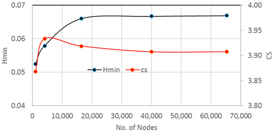 The results in this work are presented considering finite length journal bearing where the length-to-diameter ratio is 1.25, and the load is corresponding to the case of a perfectly aligned bearing with a typical value of the eccentricity ratio as 0.6. In order to better understand the geometrical design importance on the dynamic behavior of the rotor-bearing system, at first, the results will be focused on the resulting film thickness and pressure distributions due to the bearing variable geometry. Then, the investigation will be further advanced to explain in detail the effect of geometrical design parameters on the shaft trajectories under different unbalanced conditions. This sequence of presenting will give a clearer picture of the significance of the bearing profile design parameters on the system’s static and dynamic characteristics. The first step in performing the numerical solution, the independency of the results on the number of nodes, is examined as shown in Figure 4. In this figure, the values of the dimensionless minimum film thickness (Hmin) and the dimensionless critical speed (CS) are plotted against the number of nodes. It can be seen that increasing the number of nodes beyond 16,471 has a trivial effect on both results despite the narrow range of the y-axes of Hmin and CS. Therefore, this number is adopted in this analysis. Furthermore, the current model is also verified using the results presented by reference [22], as shown in Table 1. A relatively low and high value of the Summerfield numbers is used in the comparison shown in this table. It can be seen that very good agreements are found for the values of and for the two Summer field numbers.