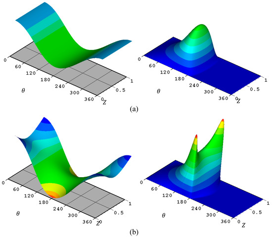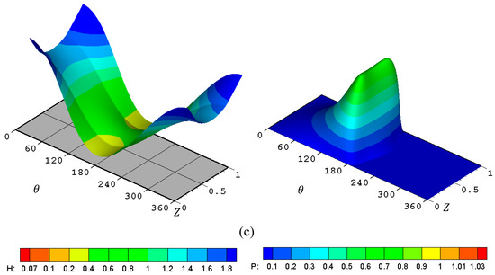 As the ideal case of a perfectly aligned bearing rarely exists in the typical applications of the journal bearings, as explained previously, the presence of misalignment is well known to have negative consequences on the general system performance. The misalignment significantly affects the film thickness, the pressure distributions, and their shape variation. Using a variable geometry for the bearing profile has the advantage of minimizing these negative effects on the system characteristics. Figure 5 shows the dimensionless film thickness and the dimensionless pressure distribution for three cases of the finite-length journal bearing. Figure 5a–c show the results for the ideal case of aligned bearing, the misaligned bearing under 3D misalignment, and the case of misaligned bearing with a modified geometry, respectively. Sever levels of misalignment are used in the case of 3D misalignment in order to illustrate how the modification can improve the bearing performance. The film thickness in the aligned case is prismatic, where the value of the film thickness at any circumferential position is constant along the bearing width. On the other hand, the pressure distribution is symmetric about the middle of the bearing width. The Hmin and Pmax values for this case are 0.4 and 0.645, respectively. The presence of the misalignment increases Pmax by 63.8% to 1.057 and reduces Hmin by 85.7% to 0.0572, representing a significant change in the designed values of the system. In addition, the film thickness distribution is no longer prismatic, and the pressure distribution is not symmetric about the middle axis of the bearing. Such a level of minim film thickness reduces the bearing life due to the expected high friction and wear ranges. In order to overcome this problem, the load-carrying capacity of the bearing should be reduced significantly to increase the value of the minimum film thickness. However, this is not an ideal solution as the bearing is usually designed for a specified supported load. Therefore, any other solution to this problem keeps the same designed load-carrying capacity without sacrificing acceptable levels of the minimum film thickness represents an important outcome. The values of the geometrical design parameters of the bearing profile can play a significant role in this direction. Improving the geometry of the bearing by removing material from the inner surface of the bearing to compensate for the reduction in the film thickness related to the misalignment has significantly positive effects on film thickness and pressure values. Figure 5c illustrates these effects where the dimensionless minimum film thickness becomes 0.244, and the maximum pressure reduces to 0.724. This represents several times improvement in the value of Hmin and a decrease of 31.5% in Pmax. The distribution shapes have also improved, particularly the pressure distribution shape, where the pressure spikes are reduced and shifted away from the bearing edges due to the improvement in the film thickness levels at the zones where the misalignment has the most negative effect.