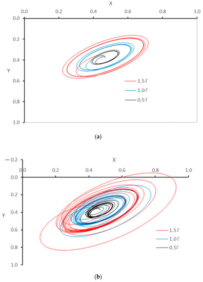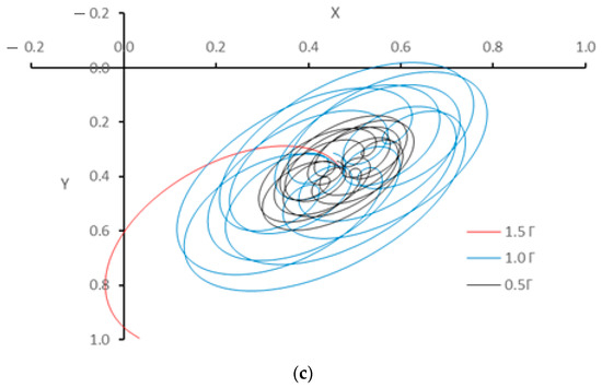 Figure 8 shows the trajectories of the journal center under different rotational speeds and unbalanced excitations (, and ) for unmodified bearing. Figure 8a–c illustrate the trajectories when which is about half the critical speed, of the critical speed, and when is equal to the critical speed, respectively. The dimensionless critical speed of the system is 2.6789 (6540.93 rpm). It can be seen that when about half the critical speed of the system (Figure 8a), the journal centers rotate about the steady-state position in almost the same path of rotation for each of the three values of . The rotation amplitude increases as increases, but in all cases, the trajectories do not cause the journal to be close to the bearing walls, and all the paths are uniform. As the rotational speed is increased, the trajectories follow different paths, as shown in Figure 8b where of the critical speed of the system. The higher value of results in a non-safe trajectory of the journal center as the journal becomes very close to the bearing wall, and any error related to installation or the designed operating conditions may bring the surfaces of the shaft and the bearing much closer. This means in other words, that the presence of the unbalance forces in relatively high levels causes unsafe operation of the system despite that the operating speed is far from the value of the critical speed as shown in Figure 8b where of the critical speed. Figure 8c illustrates the trajectories when the operating speed is equal to the critical speed. It can be seen that even for the lower value of , the trajectory is not uniform, and the amplitude of rotation about the steady state position varies with time. This variation is increased as increased as can be seen for the case of shown in blue, and the amplitude of the rotation increased rapidly for the case of 1.5 where the journal touches the bearing walls.