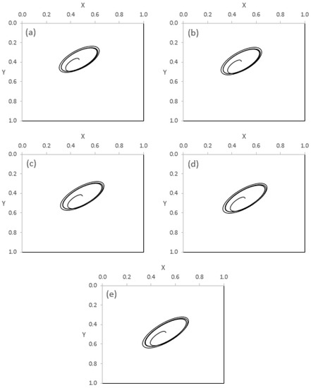 The trajectories of the journal center are further investigated by considering the bearing modification under an operating speed of 3000 rpm ( as shown in Figure 9. Different values of the geometrical parameters are considered in this figure. Figure 9a shows the trajectory for the case of unmodified bearing, and the other figures illustrate the trajectories for the modified bearing where (Figure 9b): , (Figure 9c): , (Figure 9d): and (Figure 9e): . It can be seen for this operating speed, the trajectories are uniform for all values of the modification parameters, and the journal is far away from the bearing wall. This means that modifying the bearing geometry under keeps the operation of the system in the safe range.
