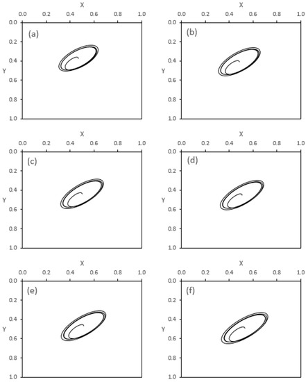 The effect of the modification parameter in the axial direction, on the journal trajectory, is investigated for a constant value of the other modification parameter (). Figure 10 shows the results of these cases when the rotational speed is 3000 rpm (1.0 ). Figure 10a shows the case of the unmodified profile, which is repeated here from the previous figure for the purpose of comparison. Figure 10b–f illustrate the trajectories for the cases when , , and . Again changing the parameter also maintains the safe operation of the system under this operating speed.