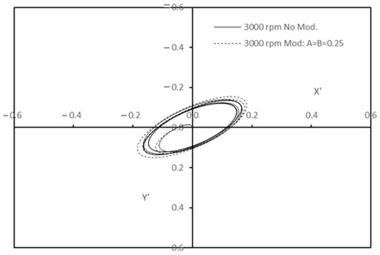 Journal trajectories for the unmodified and modified bearing profile relative to the steady state position (in terms of and coordinates) when the rotational speed is 3000 rpm (1.0 and .
