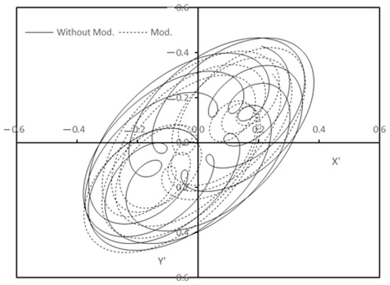 The previous figures show the trajectories relative to the bearing center using the system of coordinates. To obtain a more clear comparison between the trajectories of the modified and unmodified system, the , system of coordinates is used in producing the results shown in Figure 11. This figure illustrates the journal trajectories for the unmodified and modified bearing profile relative to the steady-state position (in terms of and coordinates) when the rotational speed is 3000 rpm (1.0 and . It can be seen that the two trajectories are very similar, with a slightly higher amplitude of the rotation in the case of modified bearing. However, as illustrated in the previous two figures, the two trajectories keep the journal surface away from the bearing wall.