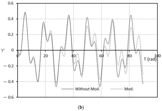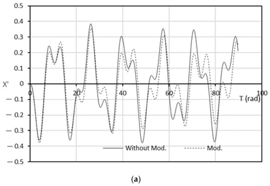 Figure 12 illustrates another comparison between the journal trajectories for the unmodified and modified bearing profile relative to the steady-state position (in terms of and coordinates) when the rotational speed is equal to the critical speed of the modified system, where the dimensionless critical speed is 2.8636 (6991.917 rpm) and the modification parameters are . These results corresponding to the case when 1.0 . Despite that both trajectories are non-uniform due to the relatively high operating speed, the journal, in the case of modified bearing, tends to rotate around the steady state position with less amplitude for most of the time. This difference can be seen clearly in Figure 13, which illustrates the variation of and with the time T (in rad) where T = and the units of and t are rad/s and second, respectively. It can be seen that as T increased, the values of and for the modified bearing are less than the corresponding values for the unmodified bearing for most of the duration of the response to the unbalance excitation.