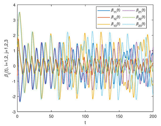 thus, one can obtain . Choose and . Then, the trajectories of the drive system and the response system can be depicted, as shown in Figure 1. It can be seen that this example is controllable.