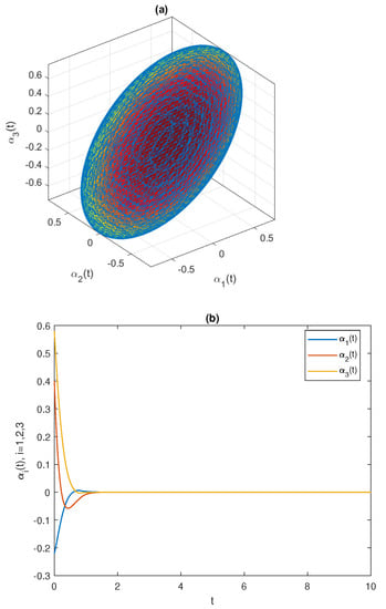 Figure 2a shows the set of the AIA utilizing Algorithm 1. Since , Figure 2b indicates that System (6) can be locally stabilized via the quantized control with actuator saturation. That is, the local synchronization of Systems (1)–(2) can be successfully achieved.