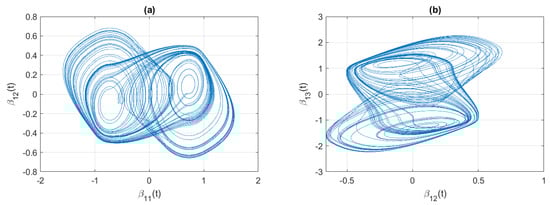 thus, it can be calculated as . Take in the simulation. Then, the chaotic behavior of the drive system can be depicted, as shown in in Figure 3a,b.