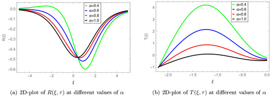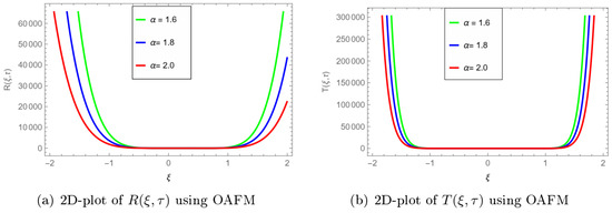 The 2D-plots of , using OAFM solution at different values of fractional order.