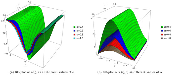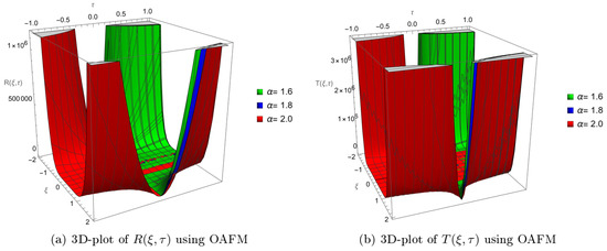 The 3D-plots of , using OAFM solution at different values of fractional order.