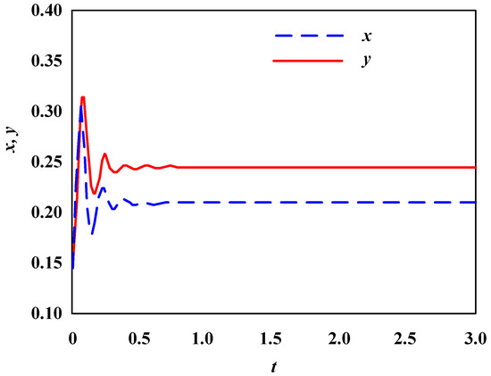 Secondly, based on the enterprise population network model shown in Formula (2), set four key parameters as follows: , , , Under such parameter configurations, observe the stability curve of the enterprise population network, as shown in Figure 2.