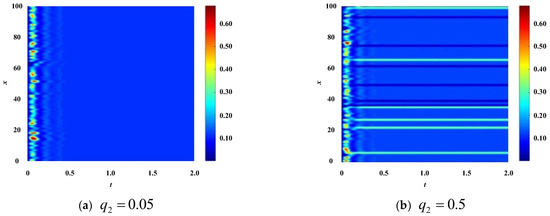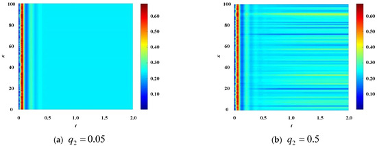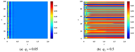 From the results in Figure 3, it can be seen that under such parameter configurations , , , , , , the stability of the enterprise population network changes as the y-direction diffusion coefficient of technological innovation in the enterprise population network changes. When , due to , the enterprise population network is stable. So, the color plane of the patch pattern in Figure 3a presents a uniform homogeneous color. When , due to , the enterprise population network is unstable. So, the color plane of the spot pattern in Figure 3b presents a situation of multicolor parallel stripes.