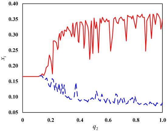 From Figure 6, it can be seen that with the change in , the trajectory of the merged enterprise in the enterprise population network changes from a stable horizontal line to two bifurcation trajectories, with their critical positions at . This is also the reason why the enterprise population network is stable when and unstable when . Comparing Figure 4 and Figure 6, it can be seen that the bifurcation trajectory of fluctuates more violently in Figure 6.