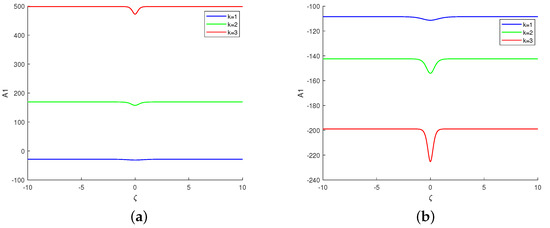 As shown in Figure 3a,b, we discuss the effect of the wave number k with and without higher-order terms. The amplitude increases with the increase in k, whereas the wave width decreases with the increase in k, which leads to the strengthening of the nonlinearity of the Rossby waves. This k-induced trend does not change when the higher-order terms vanish, but the change is more insignificant than the higher-order terms that exist.
