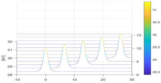 Figure 6 depicts the evolution of the baroclinic wave amplitude without the influence of higher-order terms in the three-dimensional, respectively. In the absence of higher-order terms, the amplitude of the wave is increased, and the wave pattern becomes steep. This conclusion is consistent with the change in barotropic Rossby waves.