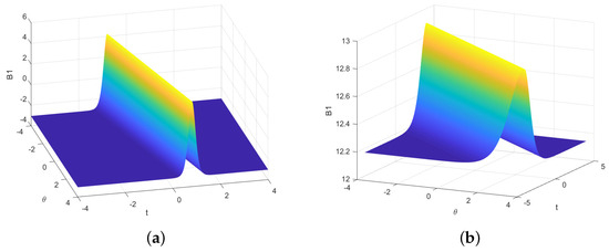 We suppose n = 2 in order to balance the highest order derivative terms , and the nonlinear terms in Equation (55). Thus, and can be expressed as follows: