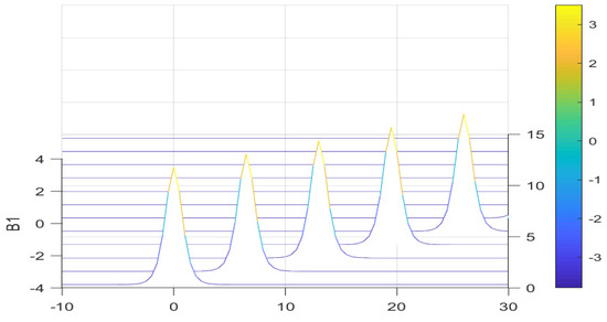 By solving the Equation (60), we can obtain two solutions, and also contains two solutions. The two solutions of are basically consistent with its corresponding Rossby wave amplitude evolution, so we select for the following research. Figure 1a shows the propagation of the barotropic Rossby waves where and in a three-dimensional plane, and Figure 1b shows the propagation of the barotropic Rossby waves where and in a three-dimensional plane. The barotropic Rossby waves can be excited under certain conditions.