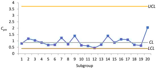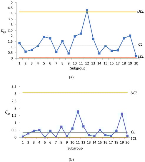Control charts are an important tool of statistical process control for monitoring the process mean, dispersion, or both to enhance customer confidence and the quality of the production process [21]. The fact that is used for the evaluation of process accuracy and is used for process precision makes it possible to incorporate and within a control chart simply by expanding the and S control charts and introducing the idea of process capability. This allows for the direct monitoring of process stability as well as precision and accuracy.