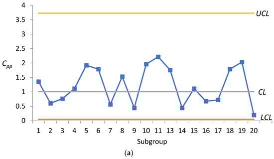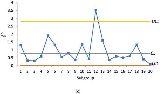 Figure 1 presents the control limits for the index control chart along with the , , and values obtained for various samples. Figure 1a,c indicates that point 12 exceeds the UCL, which necessitates an investigation into the assignable causes.