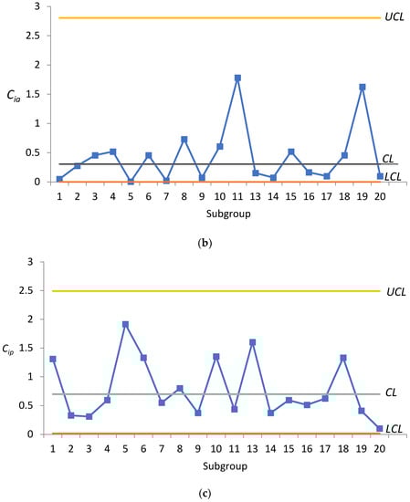 Figure 1 presents the , , and charts. The Cia chart presents all of the points located within the control limits in Figure 1b, indicating that the process accuracy is under control. The and charts indicate that point 12 exceeds the UCL in Figure 1a,c, thereby necessitating an investigation into assignable causes. Our subsequent investigation revealed that the problem with point 12 was a delay in the feeding of materials. We removed point 12 and re-calculated , , and which resulted in mean values of 1.0061, , and . The control limits for the chart are as follows: , , and . The control limits for the chart are as follows: , , and . The control limits for the chart are as follows: , , and . Figure 3 presents the control limits and the re-plotting of the charts. In Figure 3, all of the points fall within the control limits, thereby indicating that the process is under control.
