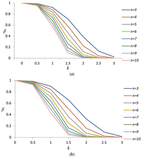 In case 1, the values of k are 0(0.5)3. The chart could not determine the effects of different mean shifts. Thus, to construct the OC curve for the and charts, we plot the -risk against the magnitude of the shift we wish to detect, as expressed in units of standard deviation for samples of various size . The OC curves for the and charts are shown in Figure 4a and Figure 4b, respectively. As shown in Figure 4a, when k is fixed, an increase in n reduces the probability of Type II errors. When n is fixed, an increase in k reduces the probability of Type II errors. Consequently, similar results were obtained for the chart (shown in Figure 4b). To summarize, an increase in n reduces the probability of Type II errors for the same k, whereas an increase in k reduces the probability of Type II errors for the same n.