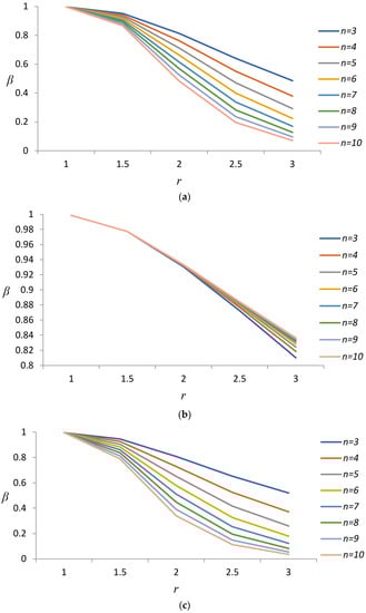 In case 2, the value of r is 1(0.5)3. To construct OC curves for the , , and charts, we plot the probability of Type II errors against the magnitude of the shift we wish to detect, which is expressed in units of standard deviation for samples of various size . The OC curves for the , , and are presented in Figure 5a, Figure 5b and Figure 5c, respectively. An examination of Figure 5b indicates that the chart is not particularly effective in detecting process shifts when dealing with samples of various sizes. Furthermore, Figure 5a,c indicates that these and charts are not particularly effective in detecting process shifts in small samples due to a negligible shift in standard deviation.